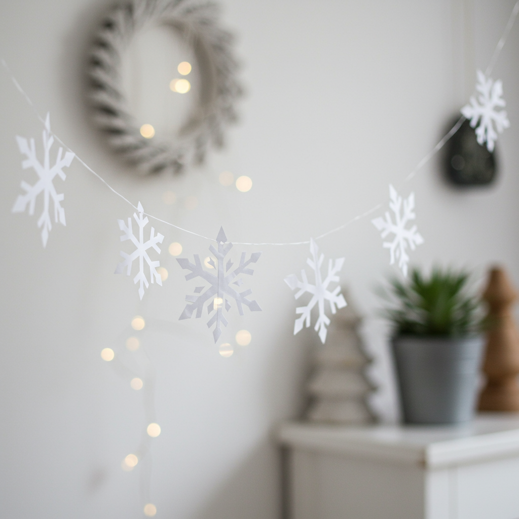 2. Paper, scissors and some string are all you need to make snowflake garland. Find patterns you love with a quick online search. Simple, bold and easy for the kids.